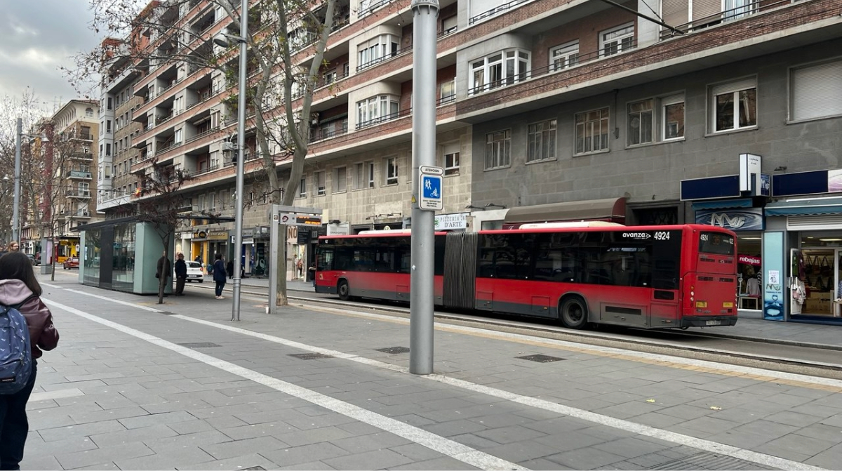 Una línea de autobús con buses dobles circula de manera paralela al tranvía en un tramo de la parte sur, en el entorno de la Universidad, la estación de Goya y Fernando el Católico