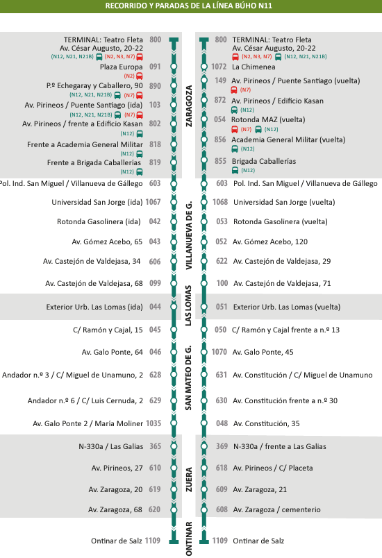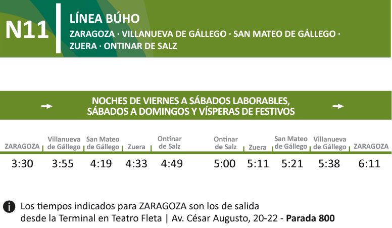El N11 une la avenida César Augusto, desde las 3:30 de la mañana, y tarda casi 3 horas en completar su recorrido de ida y vuelta tras recorrer y unir las localidades de Villanueva de Gállego, San Mateo y Zuera.