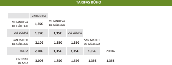 A San Mateo de Gállego, el coste del servicio es de 2,10 euros, mientras que a Zuera son 2,20 euros. A Ontinar de Salz, el coste del bus es de 3 euros por billete, aunque desde Zuera son 1,35 (la tarifa mínima).