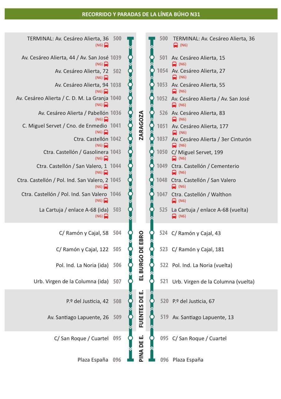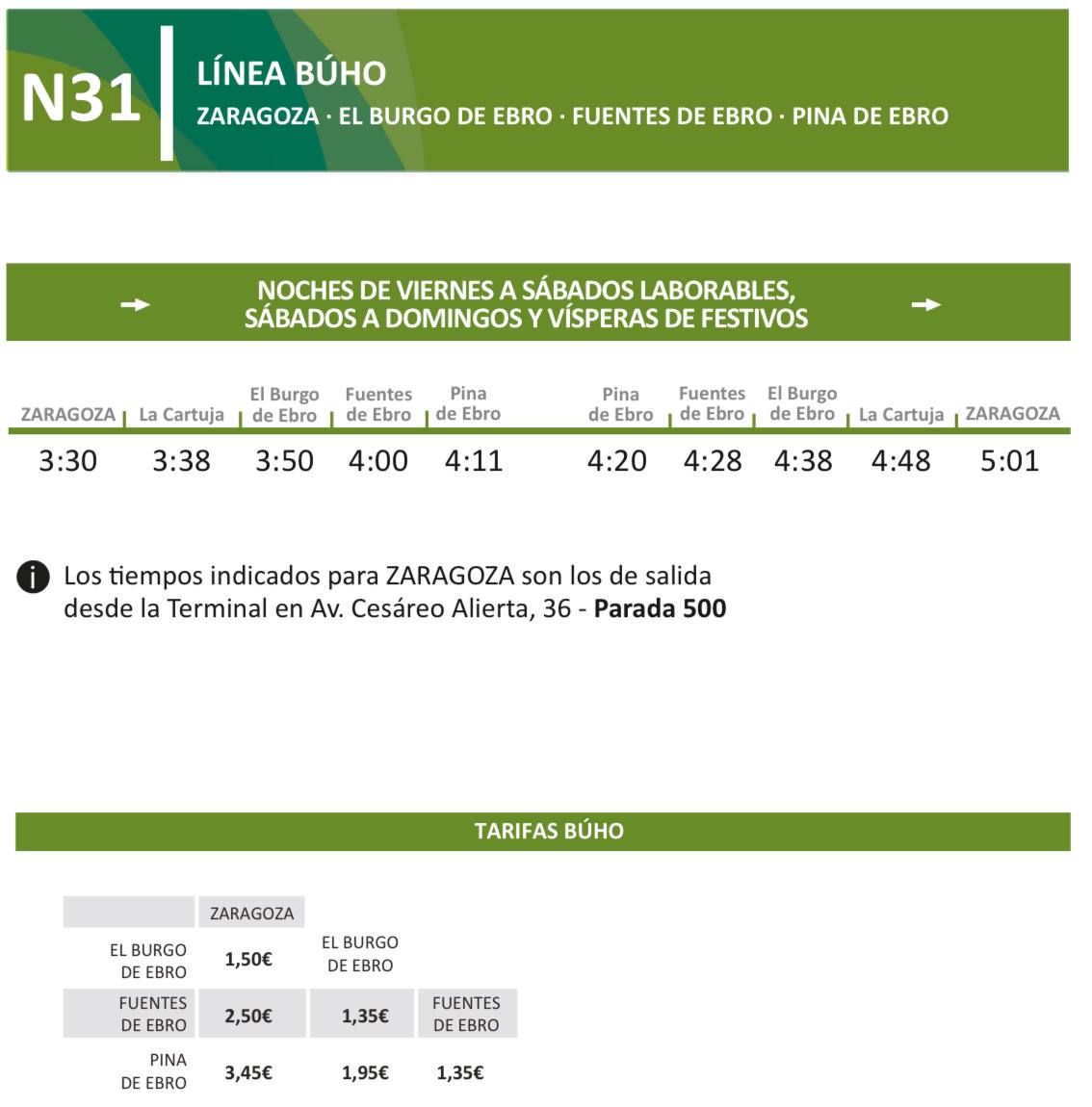 Línea nocturna búho N31 de Zaragoza a Pina de Ebro parando antes en El Burgo y Fuentes de Ebro: horarios y recorrido