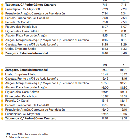 Horarios del bus de Tabuenca a Zaragoza y viceversa los lunes, miércoles y jueves, además de sábados, a continuación: