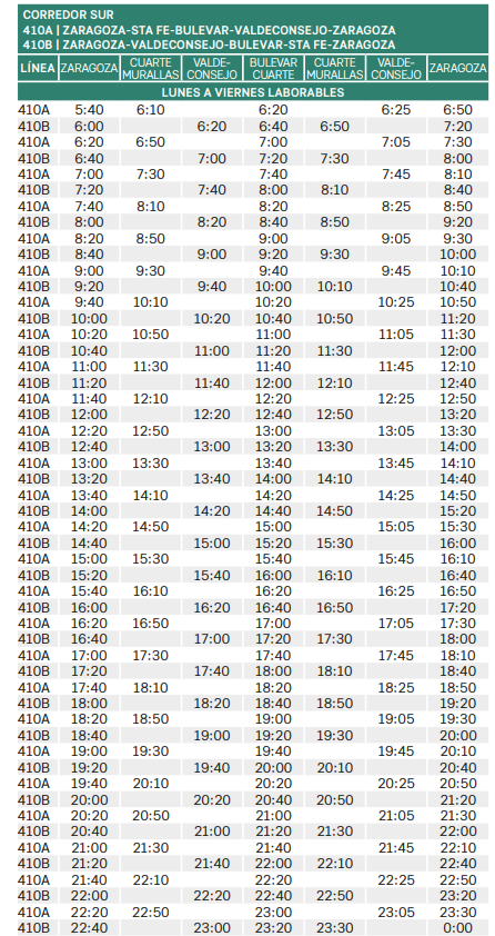 La línea 410 une Zaragoza (Intercambiador de la Plaza Emperador Carlos V) con la localidad de Cuarte de Huerva situada a seis kilómetros de la ciudad por la Carretera de Valencia (eje del Huerva o A-23). También comunica con la zona industrial de Cuarte de Huerva, situada tanto al borde de la carretera como en la propia localidad.
