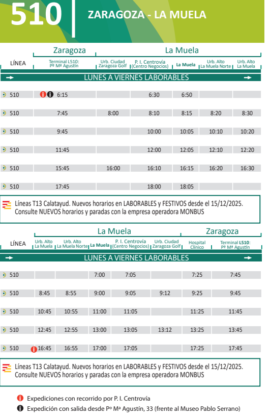 Desde el próximo 7 de enero, el servicio incrementa sus expediciones y se crea una nueva sublínea que dará servicio a Épila para que los vecinos de esta localidad puedan utilizar el bus a Zaragoza y, especialmente, los de La Muela puedan ir al médico. Más abajo puedes ver los nuevos horarios (tras los actuales, vigentes hasta el Día de Reyes, 6 de enero). También las nuevas paradas: se enlaza con el tranvía en Carlos V, junto al terminal de la línea 501. Por lo tanto, el servicio no arrancará ni terminará en el museo Pablo Serrano.