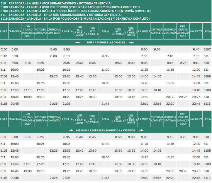 Horarios de los días laborales, sábados, domingos y festivos de la línea de Zaragoza a La Muela (actualizados desde 25 de julio de 2023):