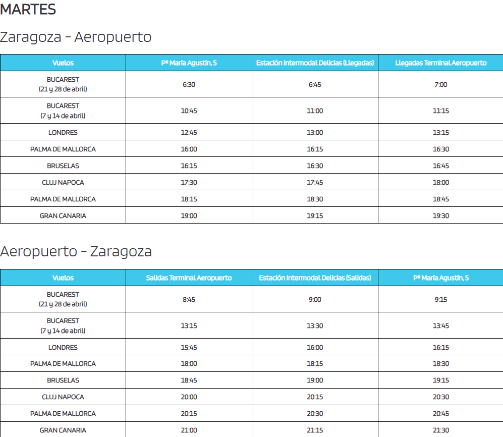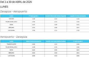 Horarios del bus al Aeropuerto de Zaragoza para el mes de ABRIL de 2026: consulta los diferentes días, a continuación, con el horario para cada vuelo