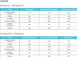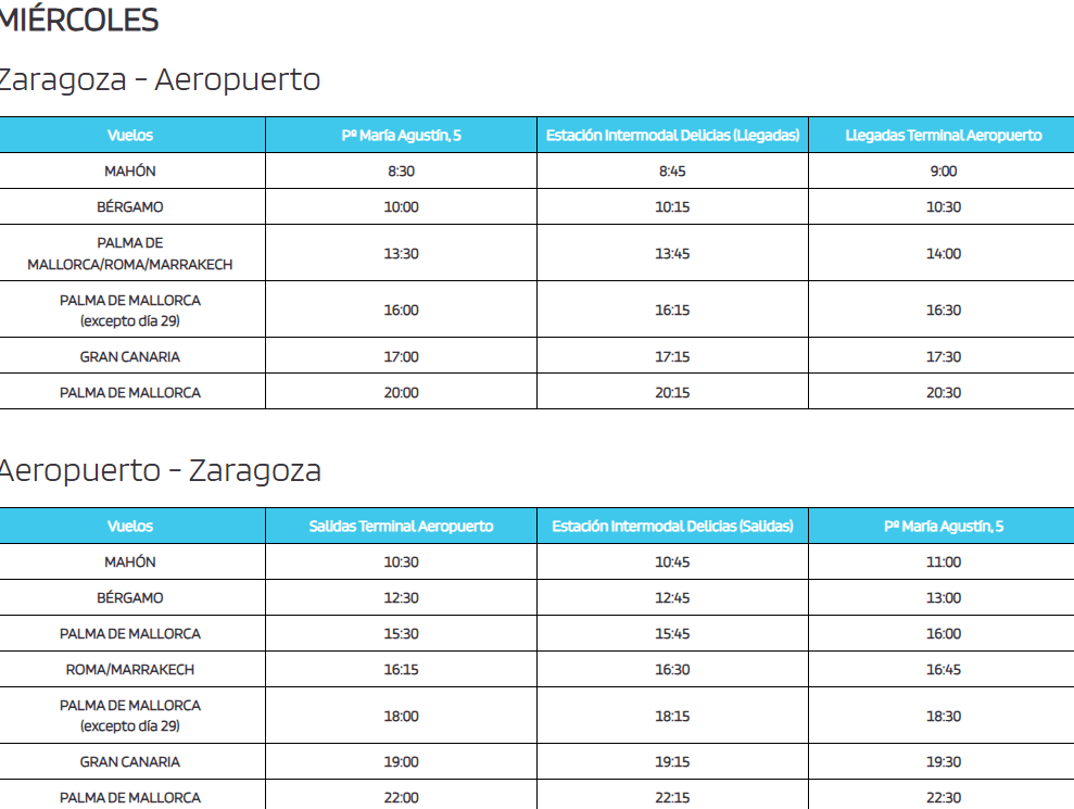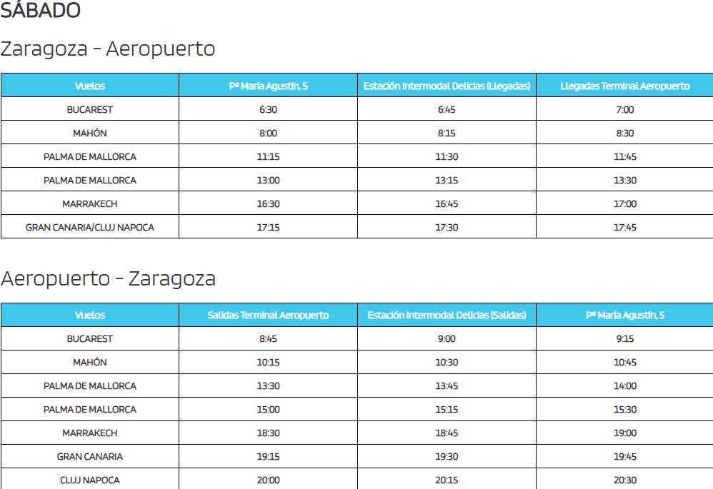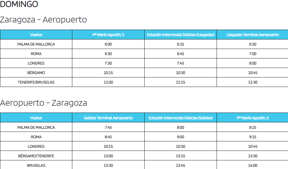 A continuación se pueden ver los horarios dirección Aeropuerto y centro de Zaragoza, separados, y el paso por cada parada en Zaragoza capital.