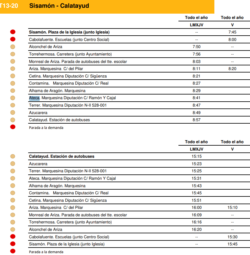 Horarios de los buses de Ariza, Cetina a Alhama de Aragón (entre otras localidades) con destino a ÚNICAMENTE CALATAYUD de la línea Sisamón-Calatayud