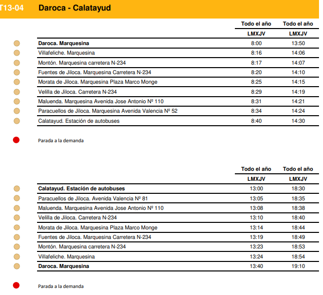 Horarios del bus de Daroca a Calatayud y viceversa vigentes en estos momentos