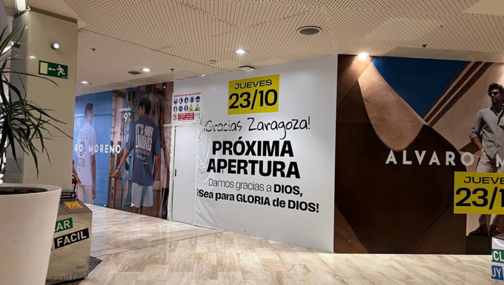 En el local que ocupará, donde ya han finalizado los trabajos de reforma del mismo, se puede ver una gran lona que anuncia la apertura para este jueves 23 de octubre con un «¡Gracias Zaragoza!» y un mensaje que reza «Damos gracias a Dios, ¡Sea para GLORIA de DIOS!!», que no ha pasado desapercibido por parte de los miles de clientes que, cada jornada, recorren esta zona del populoso centro situado en el barrio del Actur de Zaragoza.