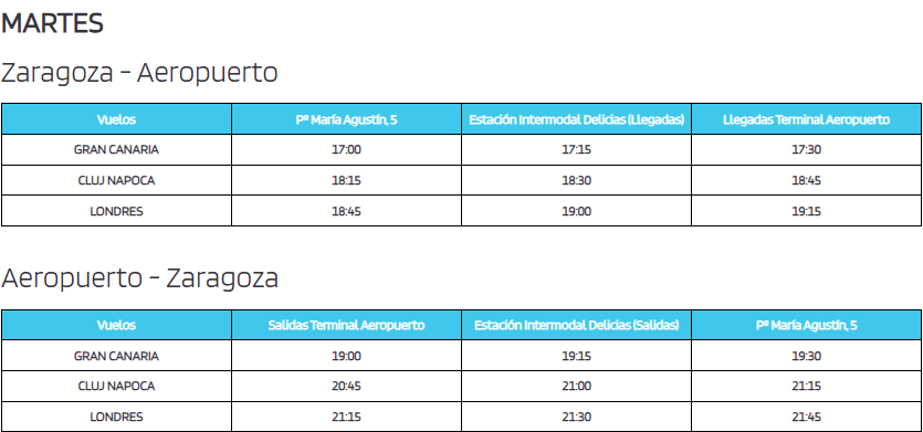 A continuación se pueden ver los horarios dirección Aeropuerto y centro de Zaragoza, separados, y el paso por cada parada en Zaragoza capital.