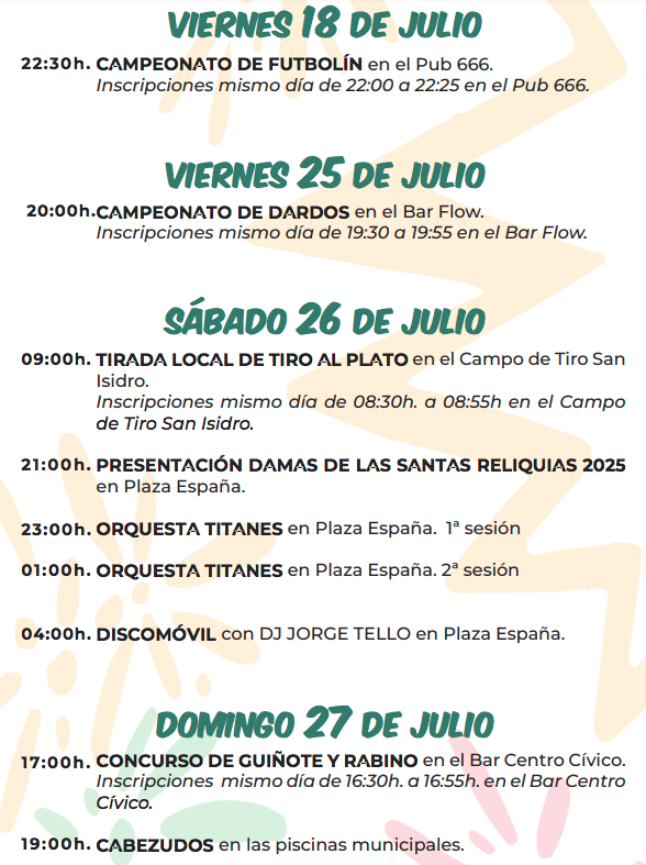 Las actividades se celebrarán del viernes, 1 de agosto, al jueves, 7 de agosto de 2025, e incluyen actividades para todos los públicos y familia. A continuación se muestran todas ellas, aunque también hay prefiestas con algunas actividades.
