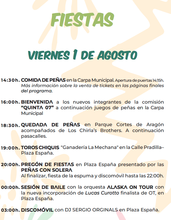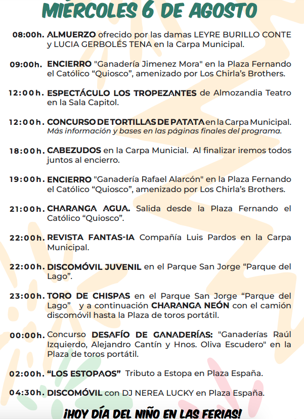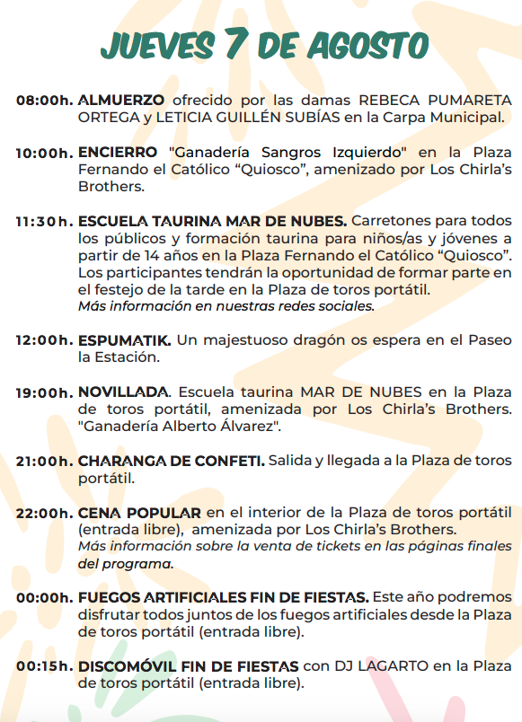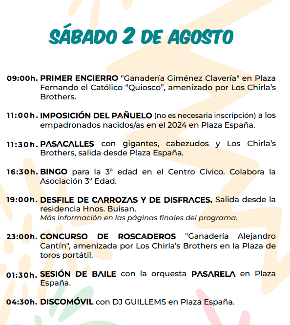 A continuación, se muestra el programa por días con todos los actos festivos facilitados por el Ayuntamiento.